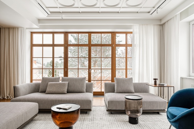 Заказчики уделяют особое внимание своему комфорту и к проекту предъявляли высокие требования. Им хотелось получить интерьер вне времени, но со своим характером. Ключом к образу стали панорамные окна, которые наполняют пространство светом и создают легкое, воздушное настроение.