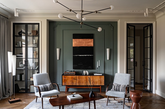 «Насчет стилистики интерьера у меня было очень много разных идей насчет. Но финальное видение сложилось уже в процессе. Все, что мне нравится, я собирала в единый пазл, поэтому для себя проект назвала Mix&Match. С самого начала были предопределены только два момента: дубовые полы французской елочкой и мрамор в ванной. Уже в процессе появились винтажные и антикварные предметы, а также искусство», - отмечает автор проекта.