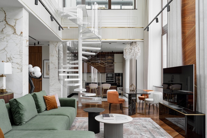Архитекторы студии Mops оформили двухэтажные апартаменты в реконструированном здании фабрики «Большевик». Они сохранили эстетику лофта, но наполнили пространство светлыми оттенками, тактильными фактурами и нетривиальным декором.
