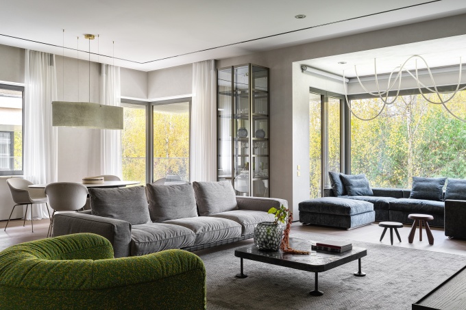 Сам дом примечателен малой этажностью, большими площадями квартир, панорамным остеклением и природным окружением в черте города. Заказчики хотели жить в гармонии с природой, находясь при этом в мегаполисе. Архитектор разработал современный интерьер, который балансирует между живописной внешней средой и минималисткой архитектурой: комфортный, эффектный, со своим визуальным кодом.