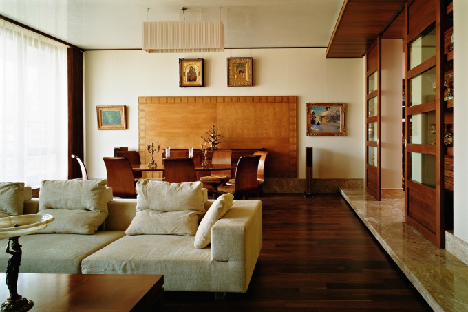 Пентхаус с открытой верандой (220 кв. м) находится в центре Москвы, из его кон открывается вид на крыши столичных домов. Перед архитектором стояла задача создать респектабельное жилье для коллекционера антиквариата и живописи.