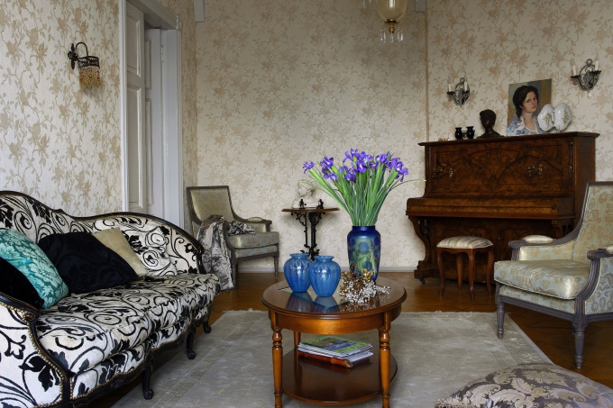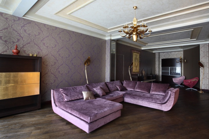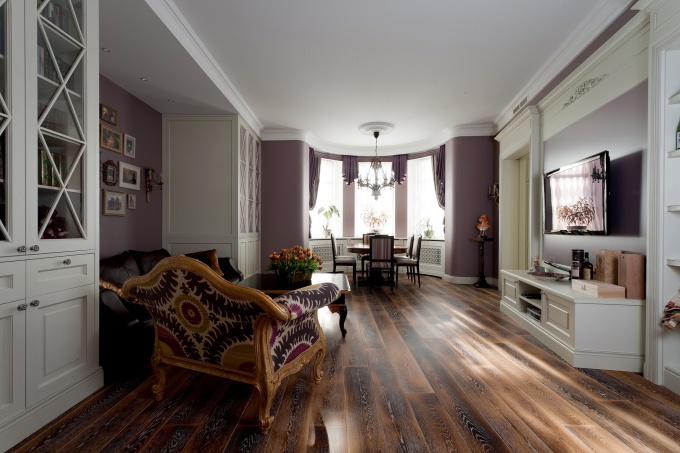 Оценив пространство, декоратор предложила сместить акценты на натуральные материалы, традиционные детали, сложные фактуры и глубокие цвета с преобладанием оттенков сирени.