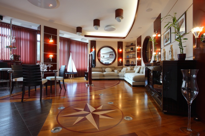 Для увлеченных яхтенным спортом заказчиков архитекторы спроектировали квартиру в стиле роскошной яхты. В ее оформлении они использовали весь арсенал средств, подчеркивающих стилистику квартиры: роскошное полированное красное дерево, окна-иллюминаторы, хромированные детали и декоративные элементы с морской символикой.