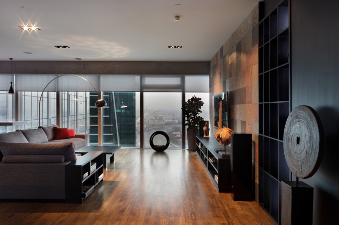 Квартира в одной из стеклянных высоток в районе Москва-Сити была сдана застройщиком под отделку. Планировка была обозначена, основные коммуникации разведены, потолки подшиты, полы выстелены, санузлы полностью укомплектованы, даже светильники частично смонтированы. Перед дизайнером была поставлена задача преимущественно декораторскими средствами создать комфортное и уютное жилье в довольно сжатые сроки (на все работы отводилось 6 месяцев).