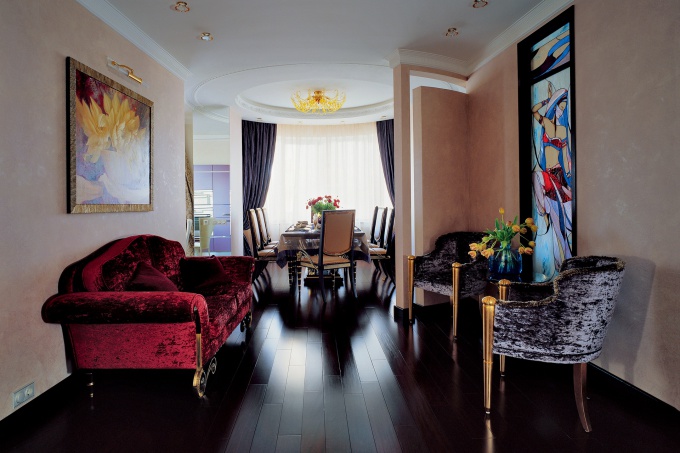 Интерьер просторной квартиры в стиле фьюжн создан в результате объединения двух квартир в монолитном доме. Авторам проекта следовало создать респектабельный интерьер для хозяина, который любит принимать гостей. В отделке использовались дорогие материалы, подчеркивающие статус интерьера: редкие породы дерева, художественные витражи, роскошный текстиль, лепнина, позолота, зеркала.