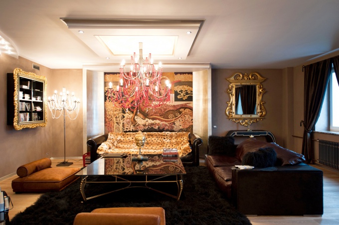 Квартира для семьи выполнена в стилистике гламура. Заказчики обратились с пожеланием создать эффектный и запоминающийся интерьер в духе ар-деко с дорогими материалами и фактурами. Например, в качестве декоративных акцентов в парадном холле они предложили использовать изделия из натуральной кожи крокодила, а при оформлении гостиной безоговорочно выбрали диваны и кресла Baxter из шоколадной кожи и шкуры пони.