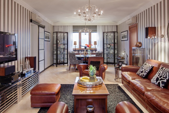 Заказчица обратилась с пожеланием переделать московскую квартиру; следовало изменить планировку, увеличить размеры ряда помещений (в частности, кухни и ванной), спроектировать гардеробную и создать удобный современный и респектабельный интерьер. Тон оформлению во многом задали кожаные диваны Baxter теплого терракотово-коричневого цвета, ранее приобретенные заказчицей, ее тяга к строгим контрастным интерьерам и тот факт, что квартира находится на высоком этаже современного жилого комплекса.