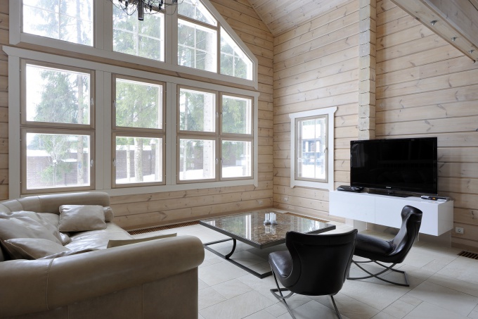 Двухэтажный дом из клееного бруса возведен по типовому финскому проекту. Его особенность – лаконичная архитектура, высокие окна с энергоэффективными стеклопакетами и крыша с большими выносами. Она защищает стены и расположенную перед входом террасу от дождя и снега. Фасады дома выкрашены плотной непрозрачной краской насыщенного темно-зеленого цвета. Интерьеры, напротив, решены в светлой палитре живого дерева с белыми обрамлениями.