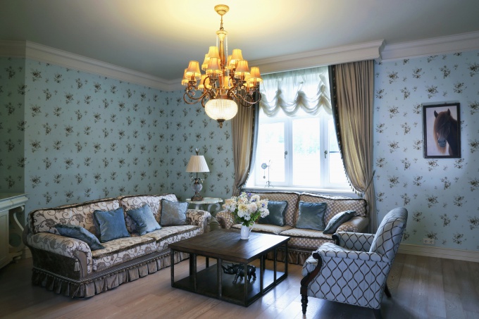 Интерьер небольшого двухэтажного дома получился свежим, уютным и очень женственным. Глядя на него, вспоминается весенний сад с первыми распускающимися цветами на фоне чистого голубого неба. Так происходит, во-первых, из-за использования в декоре разных оттенков синего цвета, а во-вторых – благодаря цветочной орнаментике, столь популярной в английских и французских неоклассических интерьерах.