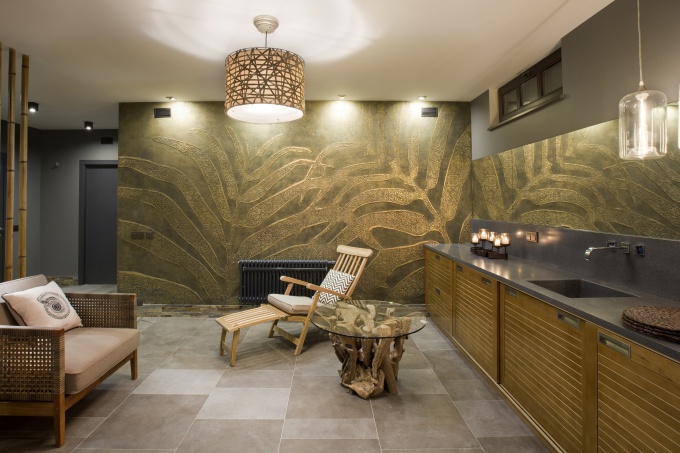 Банные помещения занимают существенную часть загородного жилого комплекса. При их оформлении заказчики дали архитекторам полный карт-бланш, и те предложили превратить пространство для релакса в подводный корабль. В качестве основной стилистики был выбран стимпанк – яркая фантазия о паровых машинах, ретроавтомобилях, механизмах, стилизованная под викторианскую Англию. Подобная гротескная стилистика требует больших пространств и солидного бюджета.