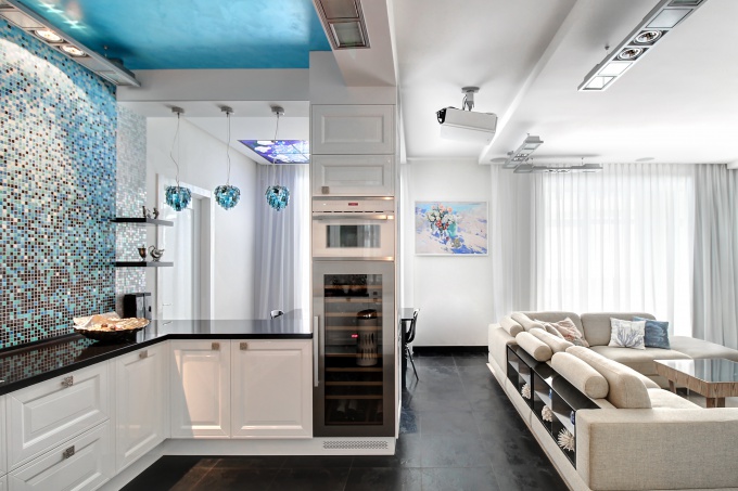 Интерьер квартиры площадью 155 кв. метров создавался для дайверов-путешественников. В декоре пространства прослеживаются приметы морской стилистики, а центральным элементом композиции гостиной является большой рифовый аквариум. Он не только поддерживает выбранную тематику, но и задает цветовую гамму, благодаря подсветке даже в вечернее и ночное время окрашивает стены в разные оттенки сине-голубого.