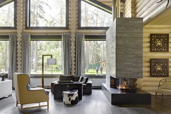 Хозяева дома площадью 400 кв. метров из оцилиндрованного бревна обратились к дизайнеру Наталии Вологдиной-Аникиной с пожеланием создать роскошный интерьер с классической линией, пышным декором, камнем и панелированием. Автор проекта предложила сохранить парадный настрой, но вывести на первый план природную фактуру открытой бревенчатой кладки.
