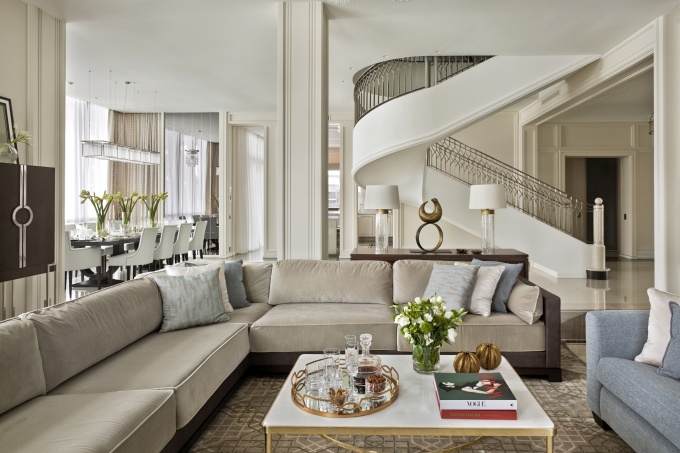 Архитектор Олег Клодт создал дом для нескольких поколений семьи, наполнил его рукотворными изделиями и создал атмосферу элегантного неоклассического интерьера в жемчужно-серебристых тонах. Интерьер решен в легкой изысканной манере и светлой, почти белой гамме, за счет нюансов цветов и фактур он сияет как перламутр.