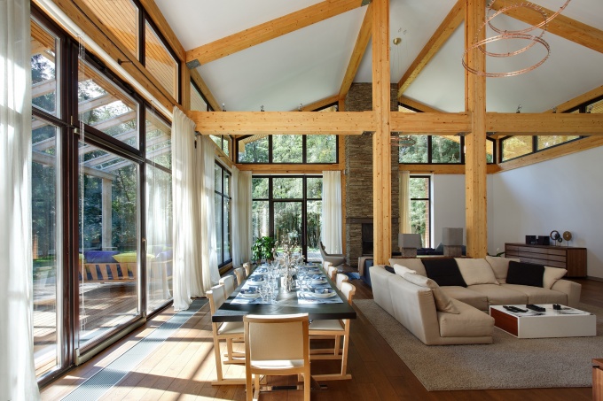 Для семьи с двумя детьми архитекторы спроектировали и оформили резиденцию, в которой обыграны черты северной природы. Главный двухэтажный дом и СПА-комплекс построены из клееного бруса сосны и расположены среди исполинских деревьев. Участок размещен на склоне, поэтому сквозь силуэты сосен просматриваются потрясающие природные перспективы. Перед архитекторами была проставлена задача создать комфортное загородное жилье, в котором природа была бы неотъемлемой частью интерьера.