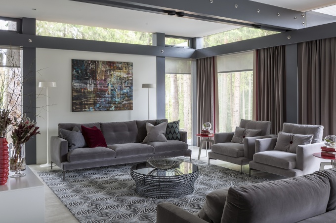 Большой объем дома с панорамным остеклением, 4-х метровыми потолками и открытыми пространствами задал внутренний масштаб, сориентировал архитекторов на крупные формы и сдержанный, но убедительный, декор.