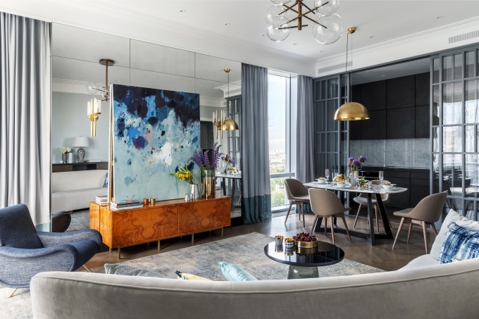 Для семьи с двумя детьми дизайнеры, выпускницы школы «Детали» Ирина Марченкова и Мария Земляных оформили квартиру в высотке на Мосфильмовской. Вдохновившись сильной, ломаной архитектурой здания с наклонными наружными стенами и панорамными окнами они создали трендовый интерьер в стилистике mid-century с изумительной небесно-голубой цветовой гаммой, винтажной мебелью и предметами высокого дизайна…