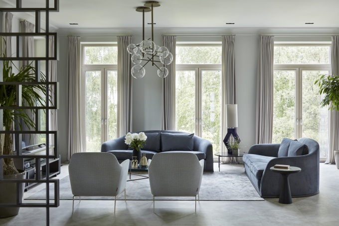 Дизайнеры подключились на стадии чистовой внутренней отделки, когда планировка была обозначена, стены подготовлены к декору, а пол всего первого этажа был облицован полированным мрамором розовато-бежевого оттенка. «Мы сразу поняли, что нужно «погасить» чрезмерный блеск камня: дом находится в окружении живописной природы, его панорамные окна ориентированы на ландшафт, поэтому хотелось создать спокойный интерьер с благородными фактурами и естественной цветовой палитрой. Благодаря доверию заказчика и слаженной работе всех участников проекта нам удалось воплотить все задуманные решения в жизнь и сделать это максимально быстро», - рассказывают дизайнеры.