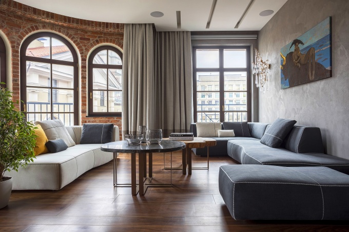 Из роскошных арочных окон этой полукруглой квартиры видны черепичные крыши квартала и древняя колокольня храма Николая Чудотворца в Новой слободе из красного кирпича. Ее владельцы – успешные бизнесмены и любители экстрима – обратились к дизайнеру Александре Афанасьевой с пожеланием создать респектабельный современный интерьер с домашним очагом и техническими инновациями.