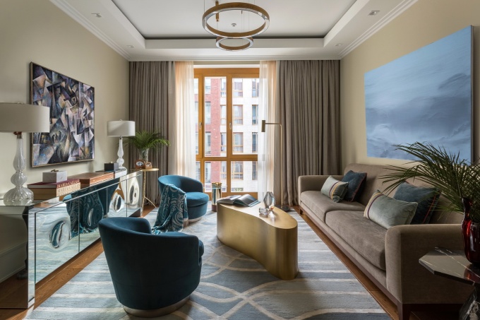 Для энергичной заказчицы – успешной бизнес-леди и коллекционера искусства – дизайнер Анна Рудакова создала комфортный интерьер для отдыха и приемов, где можно расслабиться между командировками и самолетными перелетами. Основным пожеланием стал эргономичный интерьер с тактильными фактурами и палитрой в любимых цветах хозяйки: сером, бирюзовом и приглушенном циан (цвет воды).