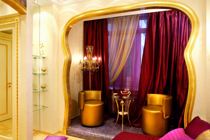 Интересно отметить, что в интерьере лоджии, созданном в направлении гламур, редко встречается выразительный дизайн стен. Наоборот, такие разновидности поверхностей, как правило, окрашиваются в пастельные приглушенные тона, в выборе которых специалисты руководствуются их принадлежностью к холодной или теплой тональности. Этим данный тип обстановки похож на минималистский интерьер лоджии, который также популярен сегодня. Для отделки потолков принято использовать натяжные полотна, отличающиеся блеском. Они бывают представлены в светлых тонах, однако встречаются также изделия более насыщенных цветов. Уникальность, отличающая интерьер лоджии в гламурном стиле, также подчеркивается посредством применения натурального камня либо ценных пород дерева в качестве напольного покрытия. Нередко пространство лоджии отделяется от интерьера соседнего помещения арками – в подобном случае они декорируются позолотой, что подчеркивает особенности выбранного решения.