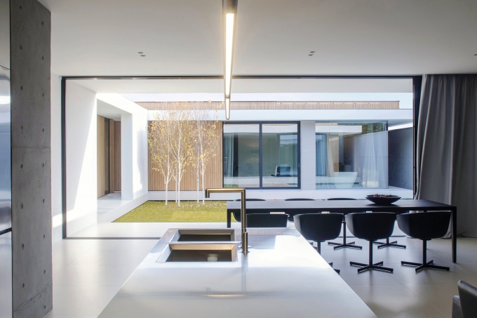 Архитектору достался участок сложной трапециевидной формы, с трех сторон окруженный типовой малоэтажной застройкой, которая во многом диктовала форму дома. Чтобы вписать здание в существующий ландшафт и максимально скрыть жилые помещения от соседей, он спроектировал набранный из нескольких объемов павильон с квадратным внутренним двором и плавательным бассейном по центру. Все жилые помещения дома выходят на центральное патио и благодаря стеклянным стенам прекрасно друг с другом взаимодействуют. Строгость и лаконичность архитектуры подчеркивает скрытая подсветка по периметру здания, она создает ощущение, будто постройка парит над землей и водной гладью бассейна.