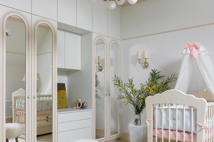 Изысканный интерьер детской в классическом стиле предполагает наличие дорогой мебели, выполненной из светлого дерева, украшенной резными элементами и позолотой. Особое внимание следует уделить кровати, над которой можно расположить балдахин, превращающий комнату в апартаменты настоящей принцессы.