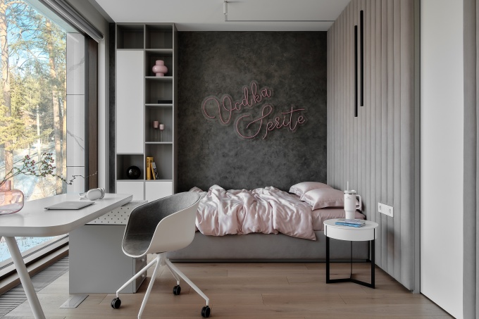 В основе концепции проекта – стремление максимально раскрыть окружающий сосновый лес и впустить природу внутрь пространства. Большие панорамные окна стирают границу между интерьером и ландшафтом, наполняя объем светом и воздухом. В отделке использованы только природные материалы и спокойная палитра с оттенками зеленых и синих цветов, а тщательно подобранные детали служат отражением личности заказчиков. Реализовать проект Ладе Шефлер помог архитектор Александр Побережнов.