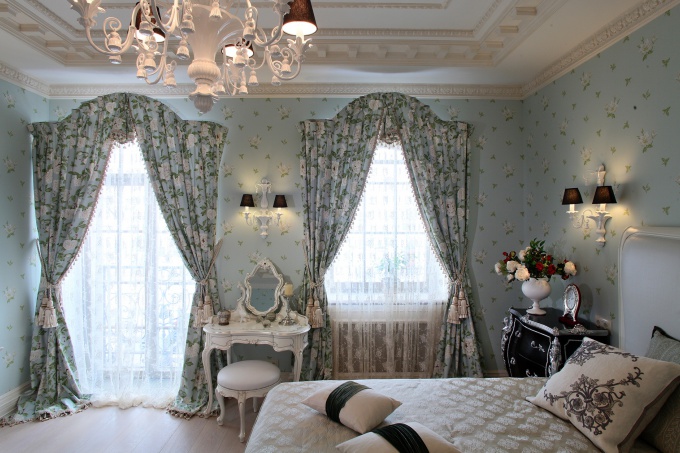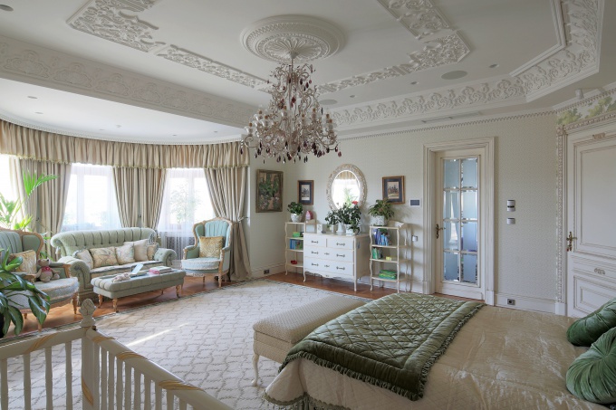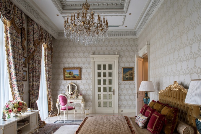 Придать атмосферу помпезности и дворцового шика поможет балдахин, расположенный над кроватью. Не менее важным при создании дворцового стиля является оформление окон. Для них подойдут плотные шторы с ламбрекенами, декоративными кистями и бахромой.