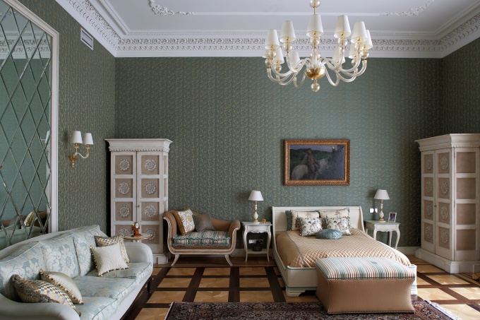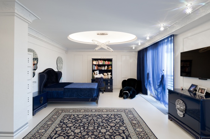 В роли изысканного украшения потолка может выступить хрустальная люстра большого размера с подвесками. А сам потолок традиционно декорируется всевозможной лепниной и элементами росписи. Для отделки стен, актуальным решением станут нежные тканевые обои в светлой цветовой гамме. Оригинальный дизайн интерьера детской в дворцовом стиле трудно представить себе без ковра, замещенного в центре комнаты. На нем может быть изображен геометрический рисунок, гармонирующий с цветовыми решениями в помещении.