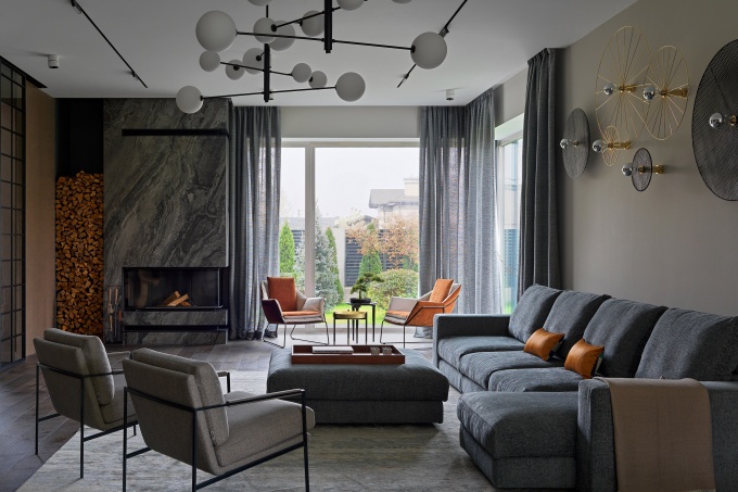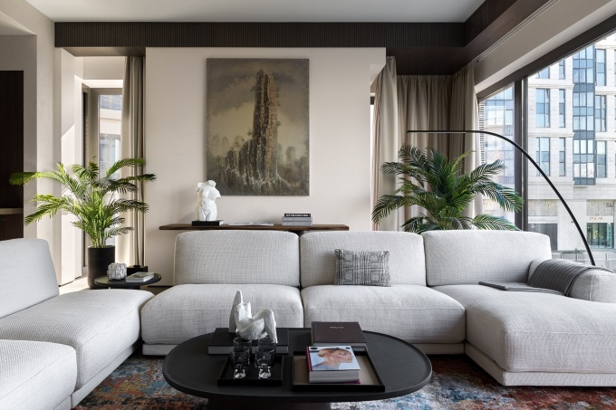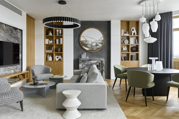 Заказчик – топ-менеджер финтехкомпании, интересуется последними техническими достижениями, его супруга увлекается современным искусством, а сын-тинэйджер занимается киберспортом. Все вместе они хотели современную и «продвинутую» квартиру с качественными материалами, эффектными деталями, но без китча. На облик интерьера во многом повлияло расположение дома и панорамные виды из окон на приватный парк с одной стороны и на магистраль с перспективой высоток с другой. Сдержанная природная палитра и урбанистические акценты стали основой декоративного решения пространства.
