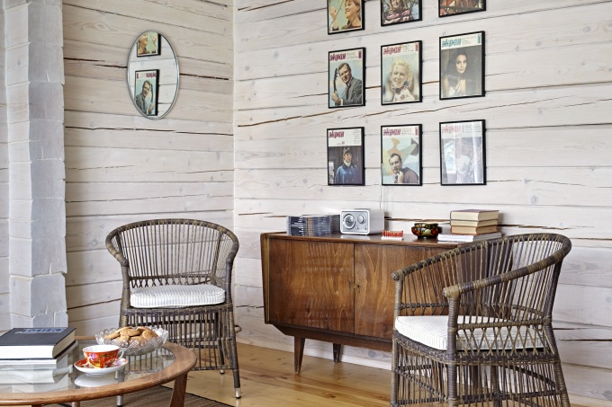 Поэтому здесь появились характерные для дачного быта кружевные скатерти и расшитые занавески, тканные ковры и винтажная мебель, советские киноафиши и предметы в стиле ретро. А сам интерьер стал выглядеть легко и непринужденно.