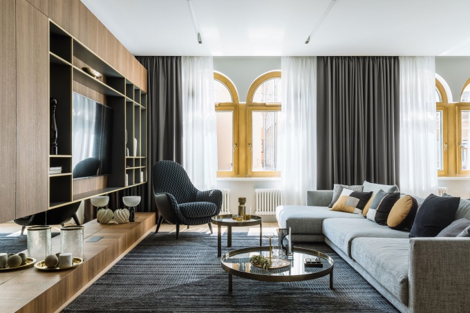 По замыслу архитекторов дома (бюро «Евгений Герасимов и партнеры»), неорусская стилистика отсылает к доходным домам XIX века и делает дом органичной частью исторической застройки Санкт-Петербурга. Именно эти окна в дубовых рамах медового цвета и вдохновили дизайнера на создание современного теплого интерьера с активной геометрией, текстурами ореха и латуни, а также черными деталями, которые еще больше подчеркивают простые формы пространства.