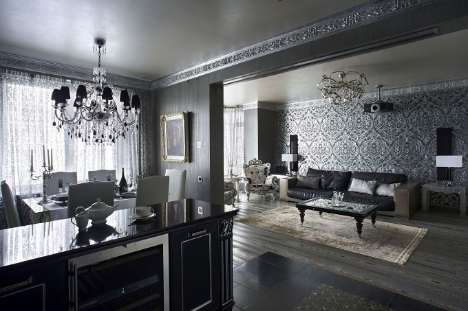Для молодой семейной пары с тремя детьми архитекторы спроектировали квартиру с рациональной планировкой (тремя спальнями и большой общей зоной для семейного досуга) и необычайно эффектным обликом. Эклектичный интерьер с элементами современной классики исполнен в монохромной цветовой гамме с преобладанием дымчатых, черных и серебряных оттенков. Благодаря деликатному мерцанию серебряных отделок (состаренного серебра, серебряной потали, перламутра) он выглядит парадным и словно сияет изнутри.