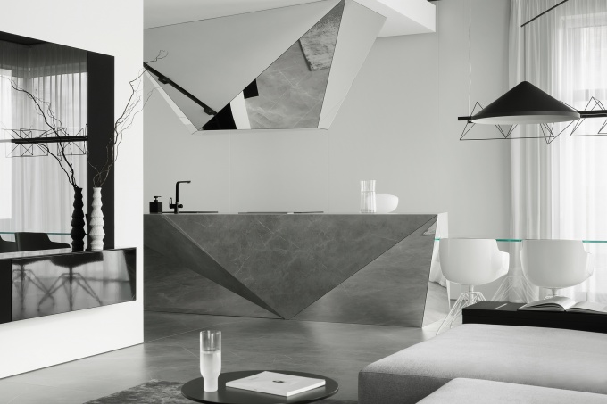 Однокомнатная квартира расположена в новом жилом комплексе «Петровская Доминанта», построенном в голландском стиле на Петровском острове в Санкт-Петербурге. «Это был чистый эксперимент и настоящая отдушина! Редко можно встретить клиента, который рискнет жить в целиком черной квартире. Черный интерьер, как черный автомобиль, – выглядит эффектно, но требует тщательного ухода. Чтобы в будущем строгая черная-белая гамма не наскучила, мы сделали много цветной подсветки, которую можно менять по настроению», - рассказывает автор проекта.