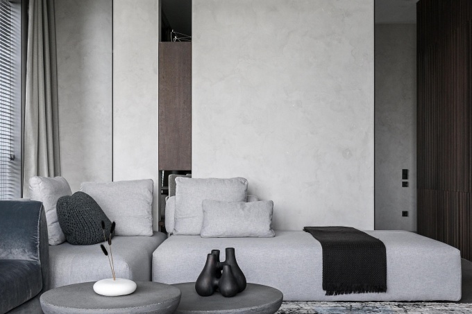 Чтобы связать интерьер с экстерьером, дизайнер Мария Белоусова, руководитель бюро Belousova.interior, предложила сделать акцентом жилого пространства панели из меди и выстроила медный куб, который стал эффектной доминантой минималистичной квартиры. В целом, заказчики хотели современный, сдержанный и запоминающийся интерьер: строгий, монохромный, с большим количеством скрытых мест хранения, без визуального шума, с воздухом и свободой в пространстве.