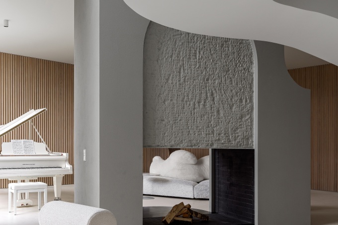 При выборе декоративного решения главным источником вдохновения стало озеро, на берегу которого стоит дом. Так появились природные материалы, тактильные фактуры и оттенки земли. Ход проекта определили и сжатые сроки – заказчики хотели получить готовый интерьер уже через год после покупки.