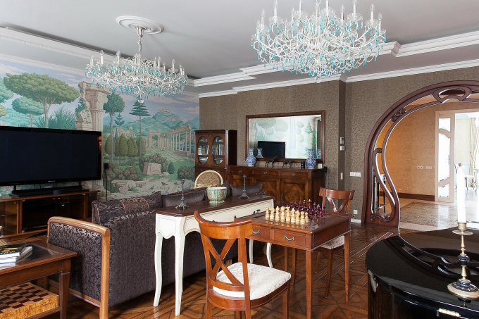 Большое внимание уделяется освещению пространства. Изысканная зона отдыха в стиле модерн насыщена романтической атмосферой. Создать необходимую обстановку позволяет неяркий, приглушенный свет. Светильники из матового, цветного стекла помогут привнести должный эффект и, одновременно, служат привлекательным элементом декора.Подобные аксессуары прекрасно дополнят неоклассический дизайн зоны отдыха.