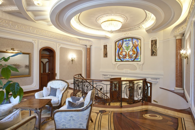 Отделка помещения выполняется из дорогостоящих натуральных материалов. Благородная древесина и мрамор, камень и керамика, прекрасные ткани помогут создать легкий, воздушный и привлекательный интерьер. Неотъемлемым элементом дизайна служат изысканные витражи. Мягкость характера, которой обладает зона отдыха в модерне фото отражает в некоторой мере.