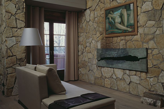 Наряду с использованием вышеупомянутого сырья, традиционный интерьер, оформленный в таком решении, предполагает также применение натурального дерева в отделке. Это позволяет сгладить массивность, характерную для отделки стен камнем, а также придает пространству более домашний вид. Не менее интересным оказывается цветовое оформление помещения – здесь специалисты рекомендуют отдавать предпочтение мягким тонам, в особенности пастельной гамме. При этом доминирует в интерьере именно белый цвет, который может выгодно обыгрываться другими оттенками.
