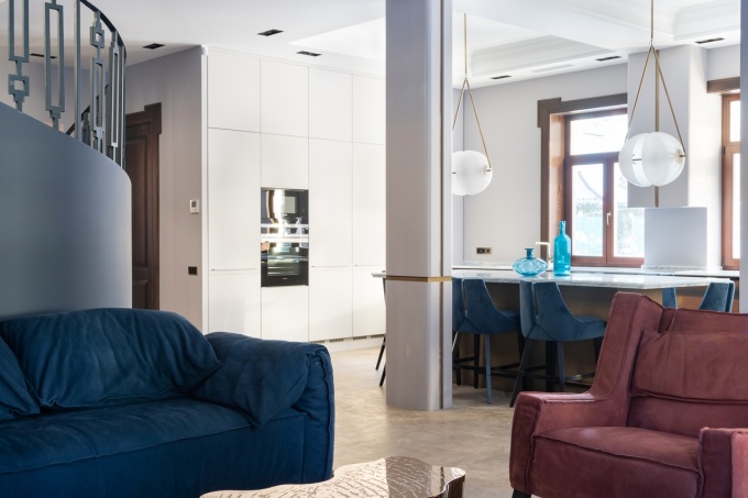 Заказчики приобрели готовый трехэтажный дом в коттеджном поселке «Трувиль» и обратились к архитекторам бюро Buro 19.23 Дмитрию Антюшину и Ирине Синельниковой с пожеланием создать яркий и нетривиальный интерьер в традициях архитектуры северных регионов Франции. Сам дом сдавался в монолите: внешние стены, перекрытия этажей, лестница выполнены из армированного бетона, без утеплителя.