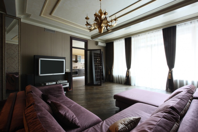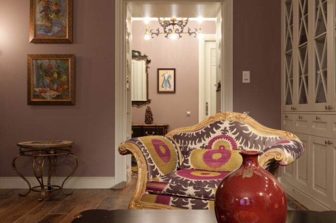 Оценив пространство, декоратор предложила сместить акценты на натуральные материалы, традиционные детали, сложные фактуры и глубокие цвета с преобладанием оттенков сирени.