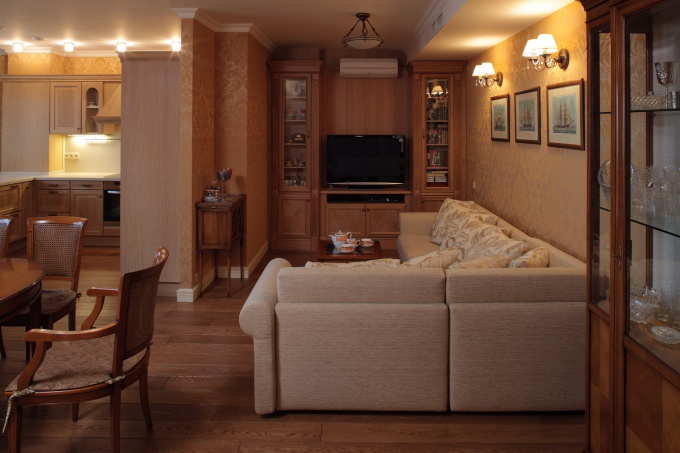 Квартира для пожилой семейной пары объединена из двух квартир. Заказчики хотели, чтобы их жилье было уютным, цветовую гамму они определили как охристо-золотую с обилием натурального дерева.