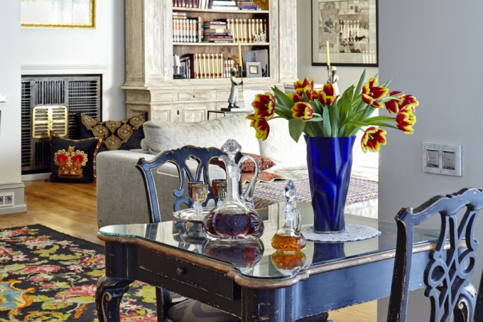 В многодельном и плотном по декору интерьере основной акцент делается на виртуозную авторскую работу: лепной декор из гипса, столярные изделия и встроенную мебель по авторским чертежам, текстильный декор и антиквариат.