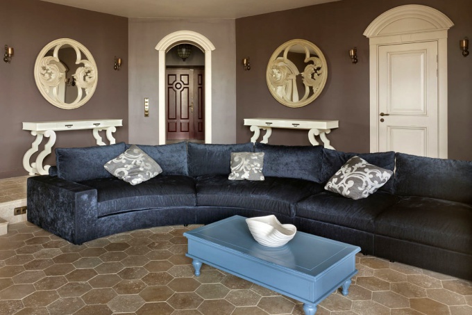 В интерьере большой квартиры со студийной гостиной отчетливо видны отсылки к двум историческим стилям: ампиру и ар-деко. Если первый ассоциируется с блеском и пафосом ушедших мировых империй, то ар-деко и вовсе называют последним роскошным стилем современности. Преобладание оттенков золота на красном или черном фоне только усиливает ощущение торжественности.
