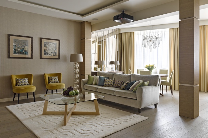 «На создание этого проекта нас вдохновил вид из окна, - рассказывают авторы проекта декораторы Ольга Щербакова и Юрий Зубенко. – Окна общих помещений обращены на Москву-реку, которая красиво сияет на свету. Чтобы поддержать эту мерцающую жемчужно-бирюзовую гладь в интерьере, мы предложили оформить полы панно из серебристой мраморной мозаики со вставками смальты цвета белого золота, и связать интерьер с роскошным пейзажем».
