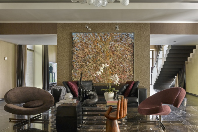 Стилистику этой парадной резиденции на берегу Москвы-реки сама автор, художник по интерьерам Марина Путиловская определяет как классику в стиле кантри, чья особенность и шарм в максимальном приближении к природе. Цветовую гамму заказчики определили сразу: им хотелось теплые, спокойные, благородные цвета, символизирующие защищенность и покой.