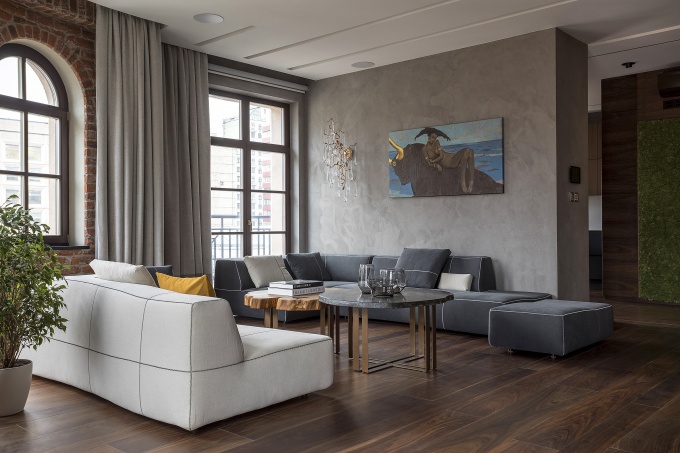 Из роскошных арочных окон этой полукруглой квартиры видны черепичные крыши квартала и древняя колокольня храма Николая Чудотворца в Новой слободе из красного кирпича. Ее владельцы – успешные бизнесмены и любители экстрима – обратились к дизайнеру Александре Афанасьевой с пожеланием создать респектабельный современный интерьер с домашним очагом и техническими инновациями.