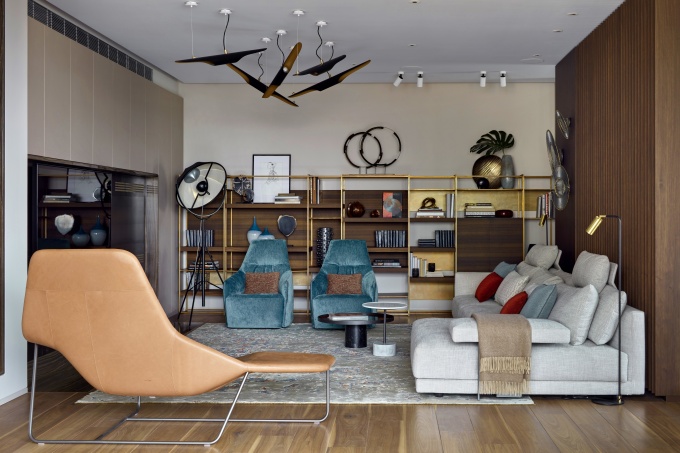 «Когда мы пришли на объект, то увидели классический для начала 2000-х интерьер с «евроремонтом»: дорогой, с качественными отделками и материалами, но морально устаревший и не соответствующий сегодняшним представлениям о комфорте», - рассказывает Тимур Шарипов. Ситуацию осложняла огромная, площадью 100 кв. м открытая терраса, объем хотелось использовать по максимуму, поэтому заказчики вместе с архитекторами приняли решение на части пространства построить стеклянный павильон и сделать его продолжением гостиной. В итоге получился современный проект с лаунжд-зоной, парадной столовой, местом для отдыха и вечеринок. Интерьер создавался для молодой пары, получившей квартиру в подарок на свадьбу. Основным пожеланием было сделать современный, стильный, но в то же время уютный интерьер с природными материалами и фактурами.
