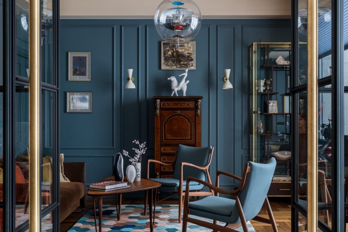 Что касается стиля, то ставка была сделана на подробный интерьер в стиле фьюжн, в котором современные предметы соединены с антикварной и винтажной мебелью и выполненными на заказ аксессуарами. В итоге получилась харизматичная квартира с нетривиальной колористикой и богемной атмосферой, которая заряжает творческой энергией.