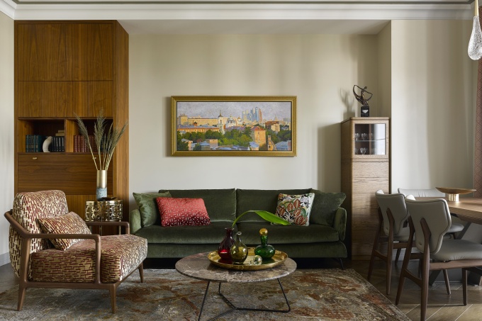 В процессе стало понятно, что заказчице близок стиль 1960-х годов, она любит рукотворные предметы, природную цветовую гамму с зелеными и рыжими оттенками, а также живопись в духе художников старой московской школы. Проект наполнился «живыми» фактурами дерева, винтажными элементами, атмосферными предметами искусства и мебелью топовых дизайнерских брендов.
